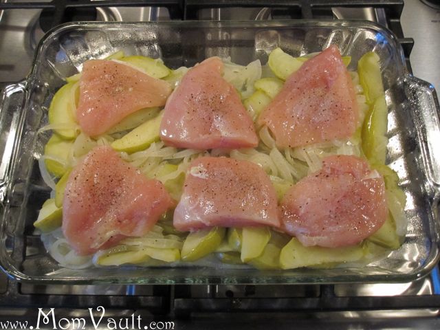 I then moved the apples and onions to the greased 13x9 and put the half chicken breasts on top. There was a bit of liquid naturally excreted from the onions and apples that will help cook the chicken in the oven.