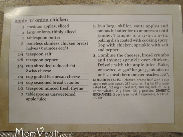 I found this recipe in the Taste Of Home “Healthy Cooking” book that was published in February 2009. First of all I love that all the recipes are recipe cards that can be removed from the book along perforated lines and added to an organizer. Anyway I perused and a found this recipe and just had to try it!