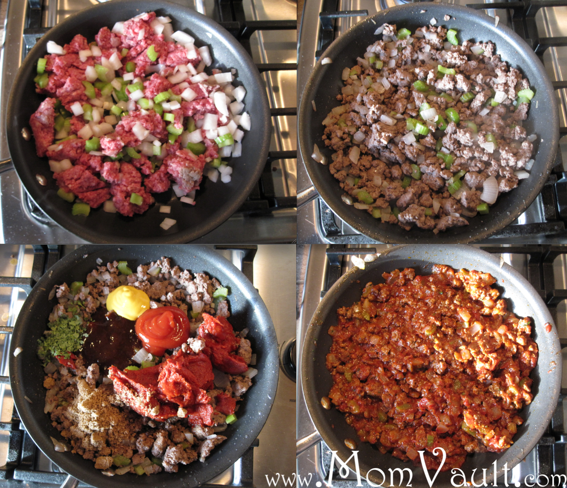 I then put the raw hamburger, onions, and celery in the frying pan until the hamburger was cook through, drained it, and returned it to the pan. I then added all the other ingredients while the burner was on low and then followed the remain instructions.