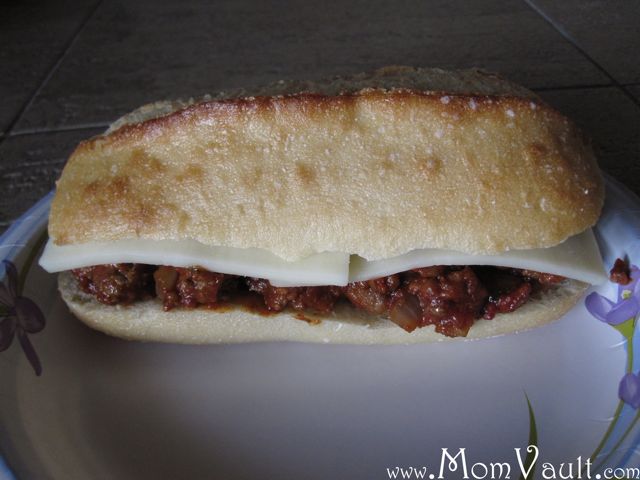This is the completed sandwich with mozzarella cheese on Costco’s delicious mini loaf french bread: