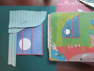 I grabbed similar patterns and colors to the illustrations and went to work. My son watched as I worked while holding the book and kept saying "Goodnight moon!" I finished with just the window and curtains done but plan to add a few more things including my son's name, the phrase Goodnight Moon, and a couple other objects from the book.