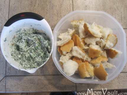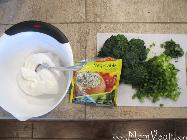 Rinse and squeeze spinach dry, chop cilantro and green onions. In a bowl combine sour cream and Knorr’s Vegetable Soup Mix until well blended then add the green vegetables. Tear up the loaf of French bread into single-dippable sizes. Chill dip before serving.