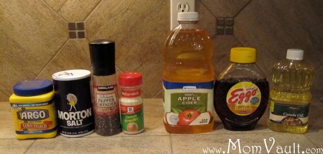 While the chicken is cooking or baking you can mix the other ingredients in the following order: Cornstarch and Cider, then Syrup and Onion Powder.