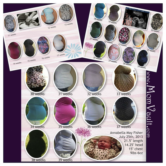 For each pregnancy I have documented my belly weekly, though I fell short by a few weeks in my second pregnancy. This is my 3rd pregnancy all the way up to birth! I used the website mixbook to easily put three pages together and then used a collage app to finish the compilation of the pages.